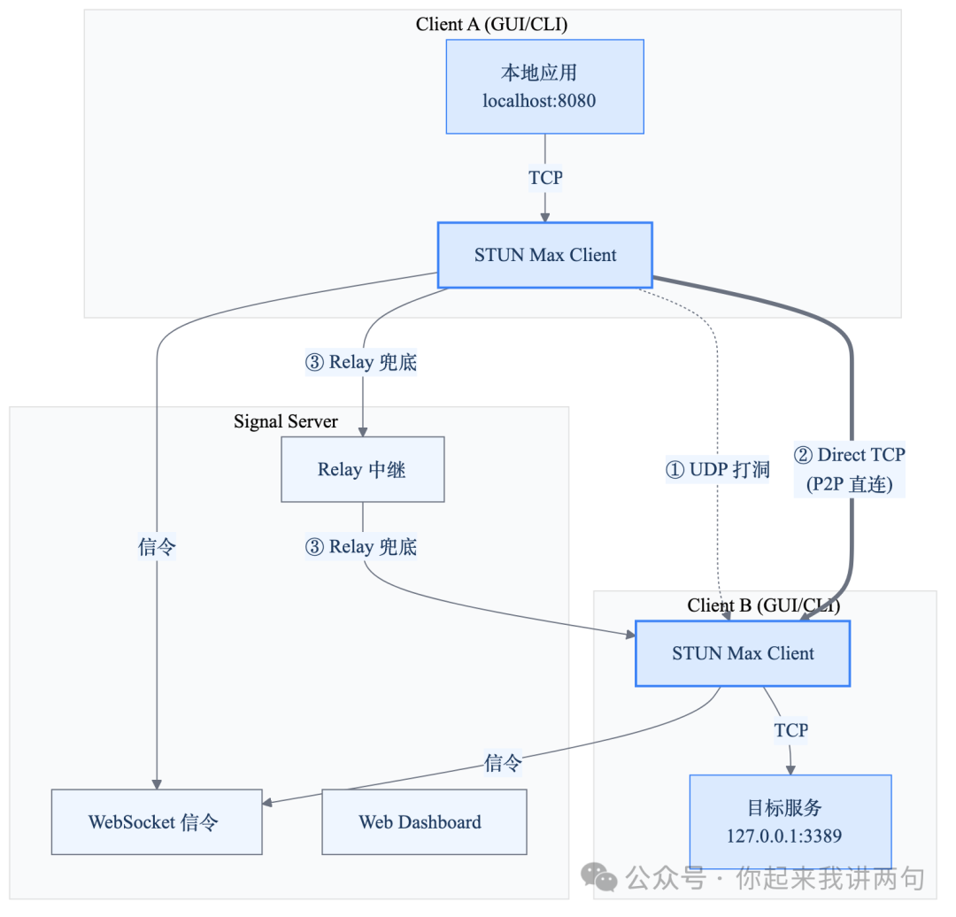 两个 client 通过信令服务器交换各自的公网地址,然后同时向对方发 UDP 包。这就是经典的「UDP Hole Punching」—— 双方同时往对方的 NAT 上「戳洞」。