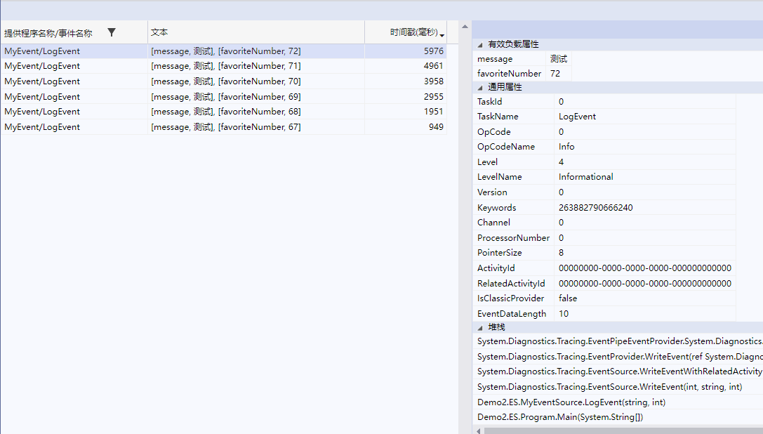 然后点击具体的事件可以观察到该事件的信息,文本列显示的是使用 WriteEvent(1, message, favoriteNumber); 记录的事件的信息,时间戳列记录了事件发生的时间,右侧属性面板显示了事件的详细信息。
