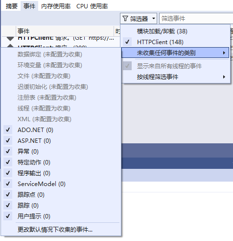 此外,通过 Visual Studio 的诊断工具也可以看到相关的事件,或者使用 dotnet-trace 工具进行收集。