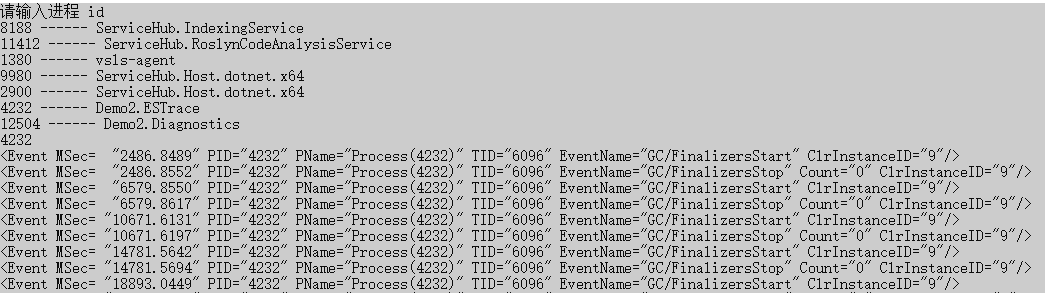 接着启动 Demo2.Diagnostics,输入控制台的进程号,即可考察到监听的进程 GC 事件。