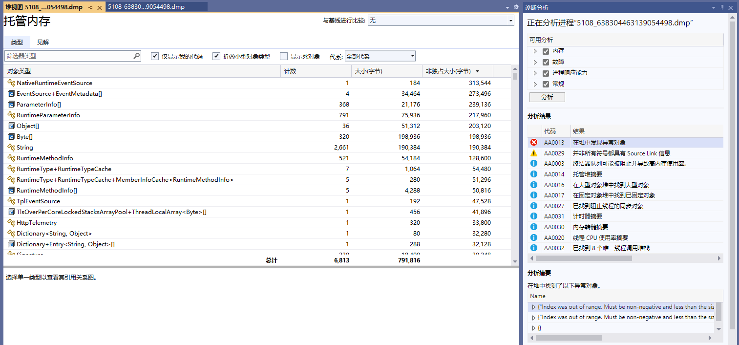 然后使用 Visual Studio 打开 .dmp 文件,可以看到很多快照信息。